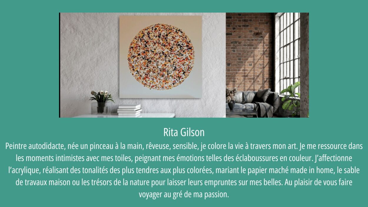 • Rita Gilson (Les couleurs d’N’RGie) – Peintre autodidacte, elle exprime ses émotions à travers des œuvres acryliques texturées mêlant couleurs et éléments naturels.