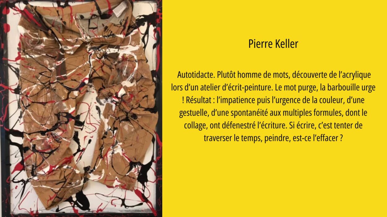 • Pierre Keller – Artiste autodidacte passé des mots à la peinture, il développe une pratique spontanée de l’acrylique et du collage, questionnant le rapport au temps.