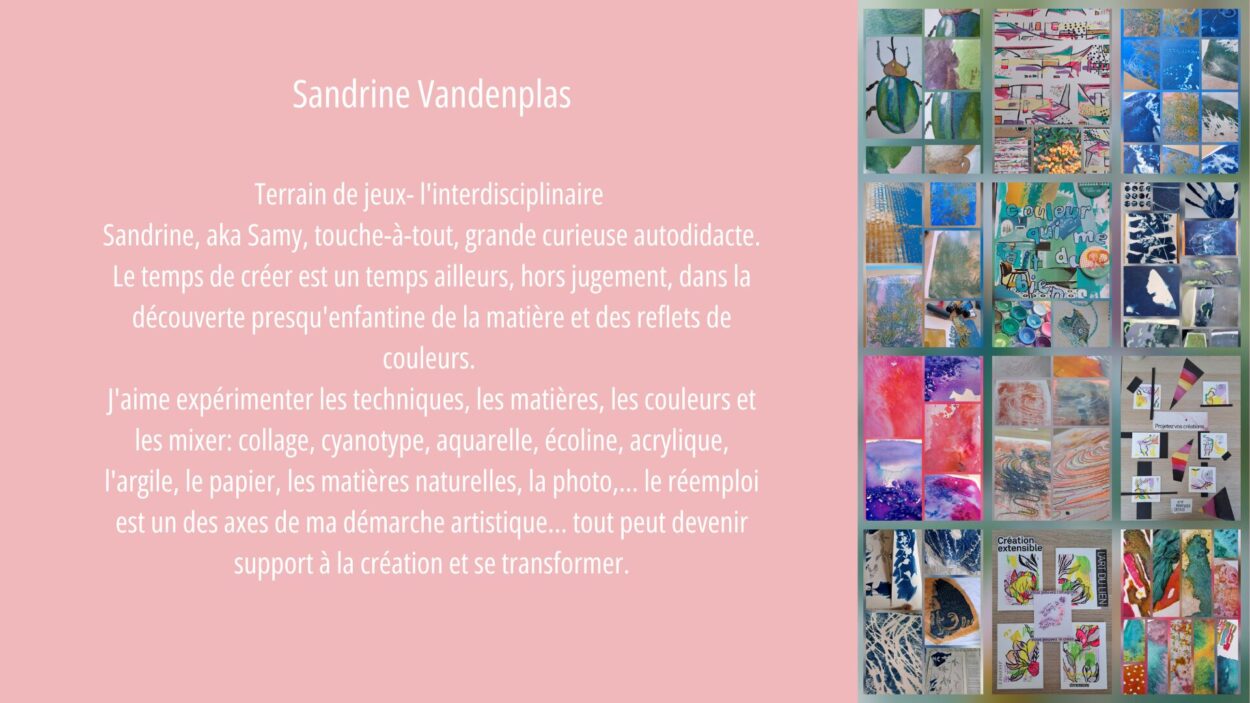 • Sandrine Vandenplas – Artiste interdisciplinaire, elle explore techniques, matières et supports dans une démarche libre et expérimentale axée sur le réemploi.